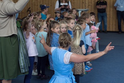 Mit dem Lied "Gute Freunde kann niemand trennen", das die Kinder über Wochen eingeübt hatten, wurden die FREUNDE-Vertreter beim Einzug auf ihrem Fahrrad begrüßt. Die Begrüßungsworte der Kindergarten-Leitung, des Bürgermeisters und der Vertreterin des Kindergartenträgers machten deutlich, FREUNDE ist angekommen in Waldhausen und man ist von der Wichtigkeit der dahinter stehenden Präventionsarbeit überzeugt.